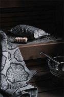Vappu Saunassa –mallistoon kuuluvat luonnonläheiset Mänty-saunatyyny ja laudeliina mustavalkoinen (45x160cm) sekä laituri kylpypyyhe tummanharmaa (75x150cm) pakattuna ikkunalliseen lahjapakkaukseen.