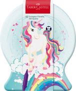 Faber-Castellin 10 Color Grip -värikynää perusväreissä, 3 Sparkle-värikynää pastelliväreissä ja ihania yksisarvinen -tarroja. Ergonomisen kolmikulmaisen muotoiltu ansiosta sitä on miellyttävä pitää kädessä. Kynät ovat murtumattomia, koska värin sydän liimataan kynään kiinni.
