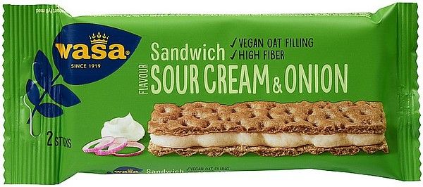 Wasa Sandwich Sourcream & Onion on täysjyvärukiista leivottu valmis välipalatuote, jossa on vegaaninen hapankermaa ja sipulia sisältävä täyte. Pakkaus sisältää kaksi sandwich-patukkaa – täydellinen välipala mukaan otettavaksi!