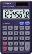 Casio SL-310UC BU. 10-numeron iso näyttö. Peruslaskutoimitukset. Verolaskenta (TAX+, TAX-). Aikalaskrnta (H/M/S). Neliöjuuri √. Casion 7-toiminen %-näppäin (mm. katelaskenta). Muisti (M+,M-,MC,MR). Etumerkin vaihto +/-. Tuhalukuerotin. Lompakkokannet. Useita eri värejä. Virtalähde: Valokenno, paristovarmennus (1xLR54). Mitat: 8x70x118 mm. Paino: 50g.